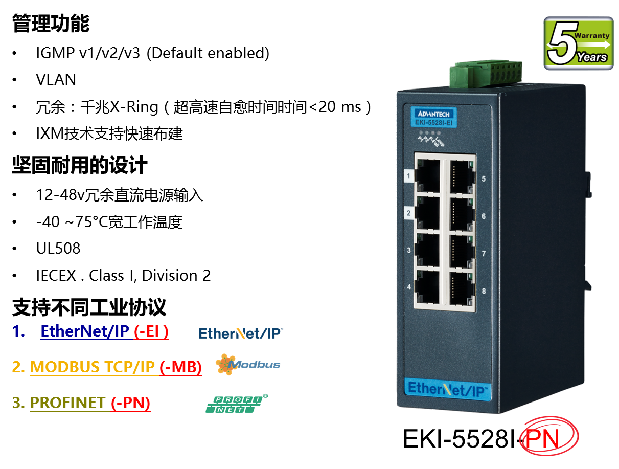在整套研華PPC-3120S+Webaccess/HMI + 協(xié)議交換機(jī)+協(xié)議網(wǎng)關(guān)的方案中,通過增加IE瀏覽器功能的客制化HMI軟件,PPC-3120S除了可以與PLC做通訊操作界面顯示外,也讓客戶實現(xiàn)可以通過IE在PPC-3120S上直接查看后臺服務(wù)器運行的MES 系統(tǒng)數(shù)據(jù)以及工位操作SOP。完美解決了將顯示當(dāng)前工位作業(yè)SOP的顯示器與HMI界面進(jìn)行整合需求,節(jié)約了客戶硬件成本同時實現(xiàn)工位空間布局優(yōu)化。 ▌▌相關(guān)產(chǎn)品EKI-5500/5600系列交換機(jī)