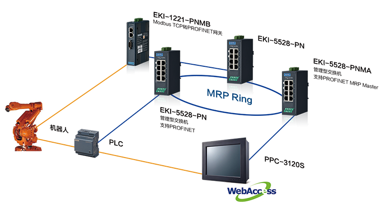 ▌▌方案設(shè)計為滿足客戶定制開發(fā)軟件的需求,研華科技推薦PPC-3120S+WebAccess/HMI,其中PPC-3120S 是基于X86架構(gòu)的硬件平臺一體機(jī),通用性強(qiáng)同時具備較好的擴(kuò)展功能(可以外接各種外設(shè),例如:條碼槍 顯示器 打印機(jī)等等),并且可市面上大部分品牌的PLC 直接連接通訊 。與PPC-3120S搭配應(yīng)用的研華Webacces/HMI人際界面軟件,不僅具備強(qiáng)大的圖形界面數(shù)據(jù)庫,可提供友好的易于整合的開發(fā)工具。最重要的是可以支持客戶需求的軟件定制,滿足客戶特殊化要求。另外PPC-3120S采用全平面觸摸屏設(shè)計,機(jī)身美觀,緊湊輕薄,適用于客戶現(xiàn)場多種安裝方式。同時兼具獨特的智能E-eye設(shè)計,可監(jiān)測一體機(jī)各個接口正常與否狀態(tài)。 為實現(xiàn)PPC-3120S與客戶現(xiàn)有PLC設(shè)備的通訊,研華科技推薦EKI-5500/5600系列協(xié)議交換機(jī)+EKI-1221IEIMB和EKI-1221PNMB協(xié)議網(wǎng)關(guān)的解決方案。在此方案中EKI-5500/5600系列協(xié)議交換機(jī),支持Profinet、EtherNet/IP和Modbus/TCP,提供跨協(xié)議通訊,實現(xiàn)設(shè)備、PLC、中控室等平臺系統(tǒng)間的有效溝通。EKI-1221IEIMB和EKI-1221PNMB協(xié)議網(wǎng)關(guān)設(shè)備,支持Modbus TCP to Profinet或EtherNet/IP, 提供協(xié)議轉(zhuǎn)換, 兼容現(xiàn)有設(shè)備,無需采購昂貴的新設(shè)備。