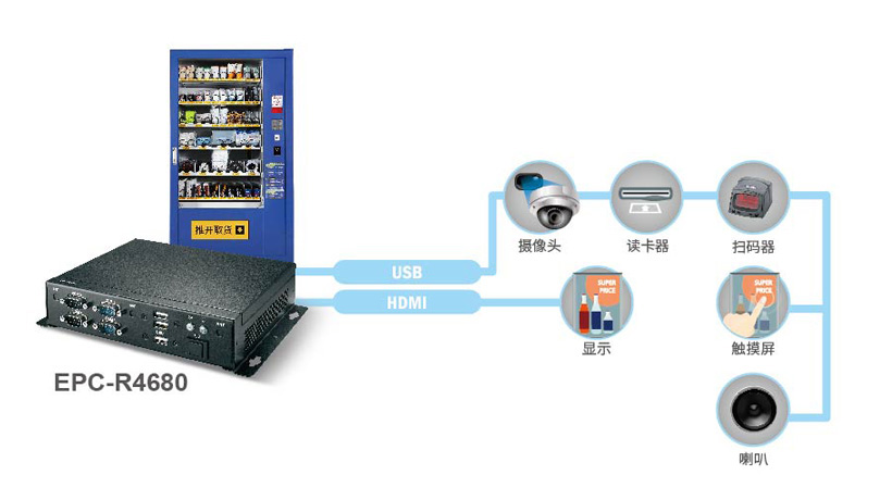 ▌▌研華方案研華提供了EPC-R4680精簡型工控機作為方案,該方案搭載Rockchip ARM Cortex-A17 RK3288 Quad core高性能處理器,穩(wěn)定可靠。同時支持4K 顯示及 4Kx2K多格式HDMI視頻解碼。此外,配有M.2, Mini-PCIe 及支持WIFI的SIM卡卡槽、支持BT及4G連接,6 USB 2.0, 6UART, 1 GbE 及 8 GPIO的豐富接口,是KIOSK、販賣機及數(shù)字標牌應用的理想解決方案。同時,1U的小尺寸,滿足客戶緊湊型需求。
