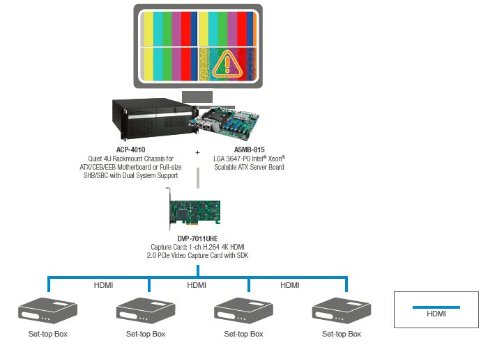 完整的解決方案包括ASMB-815服務(wù)器主板和Xeon CPU以及多達(dá)五個DVP-7011UHE圖像捕獲卡??ㄉ系腍DMI視頻輸入會捕獲來自機頂盒的HDMI 2.0信號,然后使用SDK開發(fā)的應(yīng)用會檢查視頻信號,從而有效地實現(xiàn)了全自動的檢查過程。