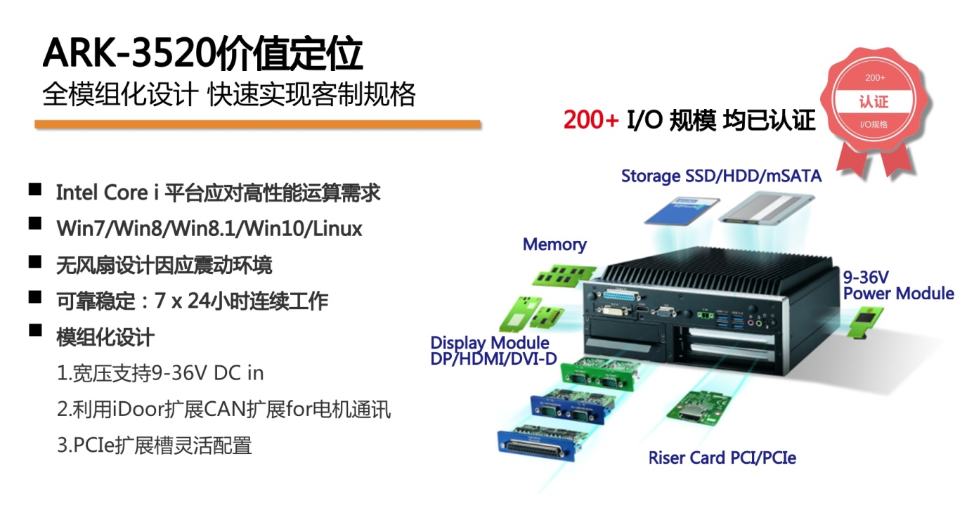 ![]() 研華嵌入式無風扇工控機,采用模組化設計,將功能模塊做選配設計,因?qū)Ω骺蛻粜枨笞龌蚝喕蚍钡囊?guī)格配置,ARK-3520此單一機種可以達到200多種規(guī)格,且全部認證,以便快速打造客戶方案。針對AGV內(nèi)部供電不穩(wěn)定,ARK-3520還增設寬壓模塊,規(guī)格9-36V,基本可以覆蓋絕大多數(shù)工業(yè)場景應用;透過IDoor擴展CAN BUS,以連接電機;還有靈活的PCI(e)擴展槽,以連接運動控制卡,如有需要請致電聯(lián)系我們 以上案例來自研華官網(wǎng)